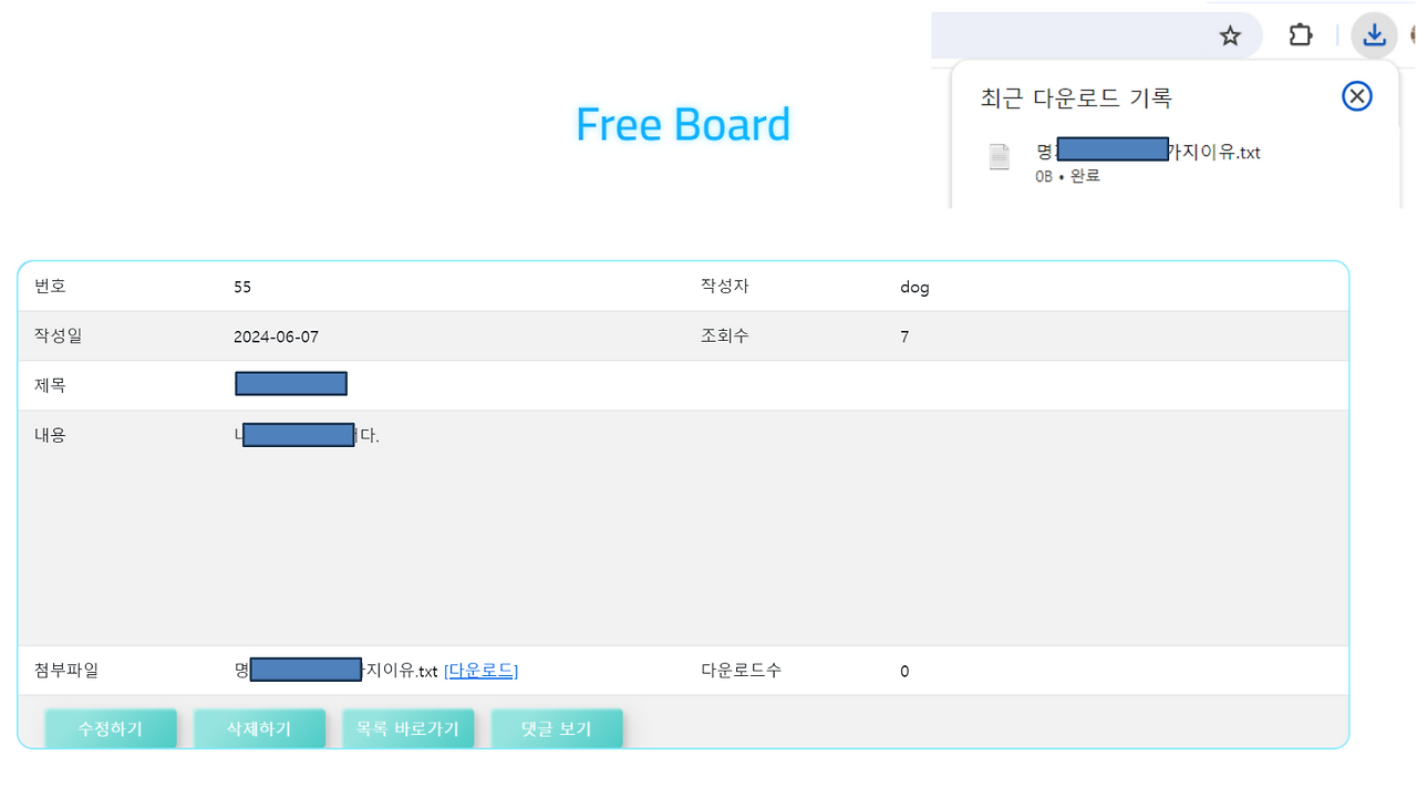 - 게시판 쓰기, 읽기, 수정, 삭제 가능하고 게시판 내 댓글 또한 게시판과 같은 기능을 가짐